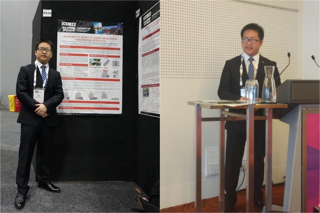Student assistant Jinqiao Jiang attended ICCM22 in Melbourne, Australia and had an oral presentation entitled "An atomistic study of creep behavior in fiber/matrix interface". The conference paper is authored by C. Wu, J. Jiang and L. Tam.