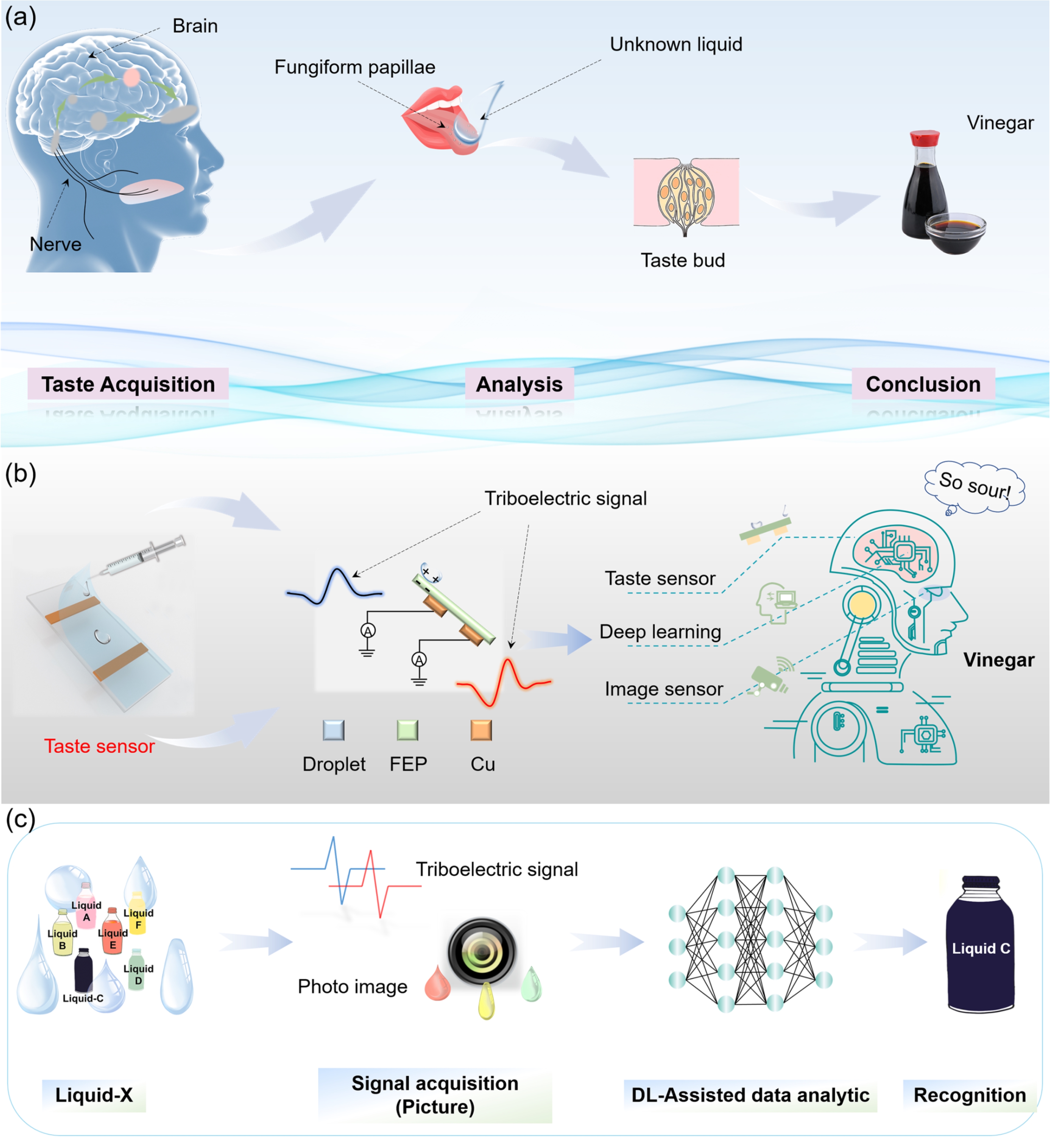 Wei Xuelian, Wang Baocheng, Cao Xiaole, Zhou Hanlin, Wu Zhiyi*, Wang Zhong Lin*. "Dual-sensory Fusion Self-powered Triboelectric Taste-Sensing System Towards Effective and Low-Cost Liquid Identification. " Nature Food, 2023, 4(8), 721-732.