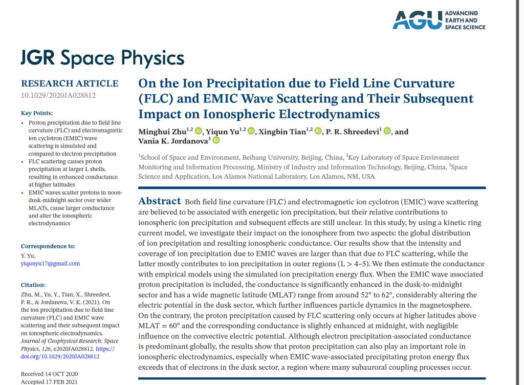 Congratulations to my PhD student Ms. Minghui Zhu, for getting her first paper published in the Journal of Geophysical Research-Space Physics.