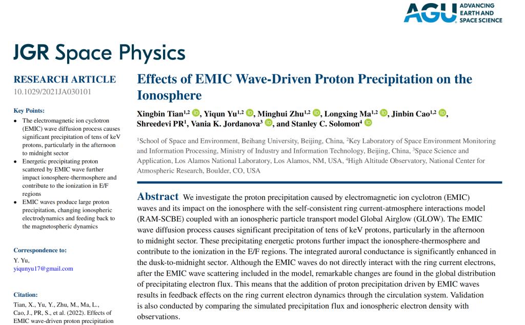 Congratulations to PhD student Mr. Xingbin Tian for getting his second paper published in the Journal of Geophysical Research: Space Physics.